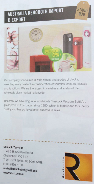 Please visit our distributor in Australia, Australia Rehoboth Import & Export Pty Ltd, at Stand Q30 Gift & Homewares, Queensland on July 5-7, 2014.